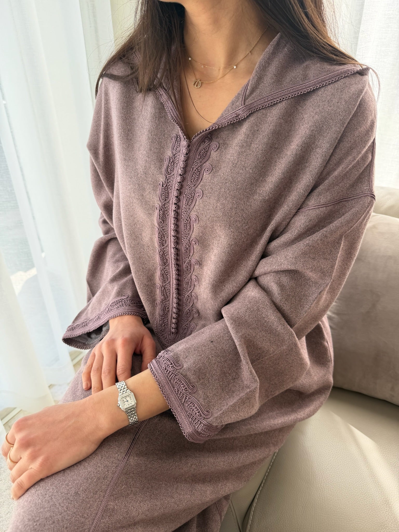 Discover Rola, our refined jellaba crafted from a purple-grey cachemire mlifa fabric and adorned with silk "zwaaq maalem". It is ideal to feel warm and elegant in autumn and winter.
